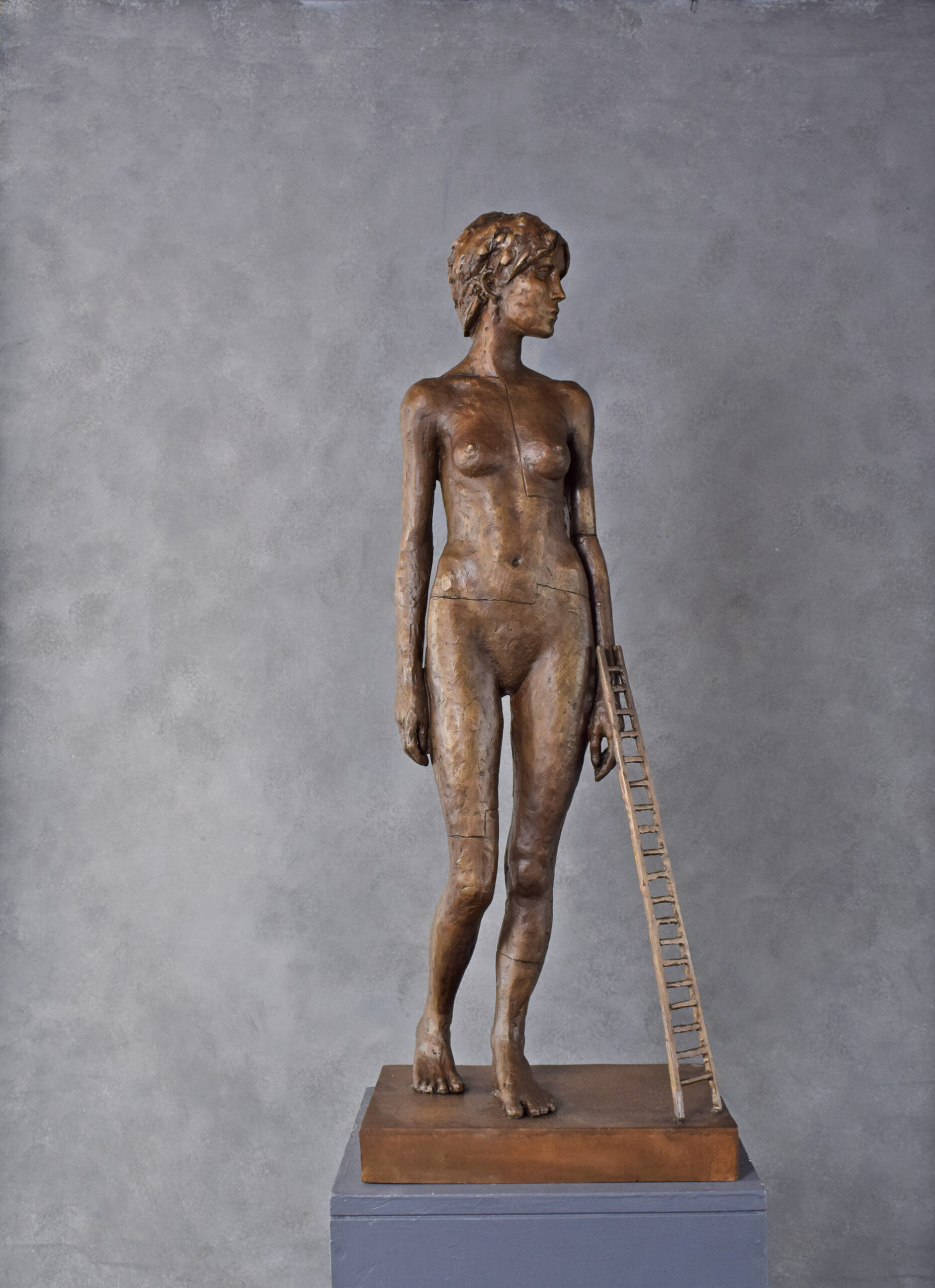 The otherwise slight-looking womanis portrayed as a monumental statue illustraed with the placenet of the ladder beside her. A godess under construction. Height 83 cm