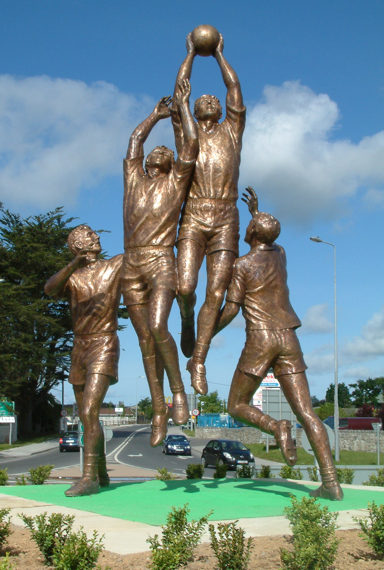 A massive depiction of four footballers fielding a ball set on a roundabout in Tralee. Commissioned to celebrate County Kerrry’s heretige in the sport. Height 3.5 m